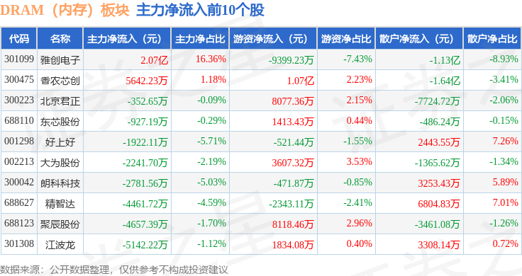 从资金流向上来看,当日DRAM(内存)板块主力资金净流出51.19亿元,游资资金净流入14.93亿元,散户资金净流入36.26亿元。DRAM(内存)板块个股资金流向见下表: