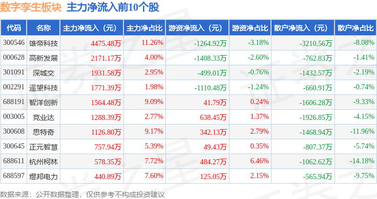 从资金流向上来看,当日数字孪生板块主力资金净流出17.07亿元,游资资金净流入6.21亿元,散户资金净流入10.87亿元。数字孪生板块个股资金流向见下表: