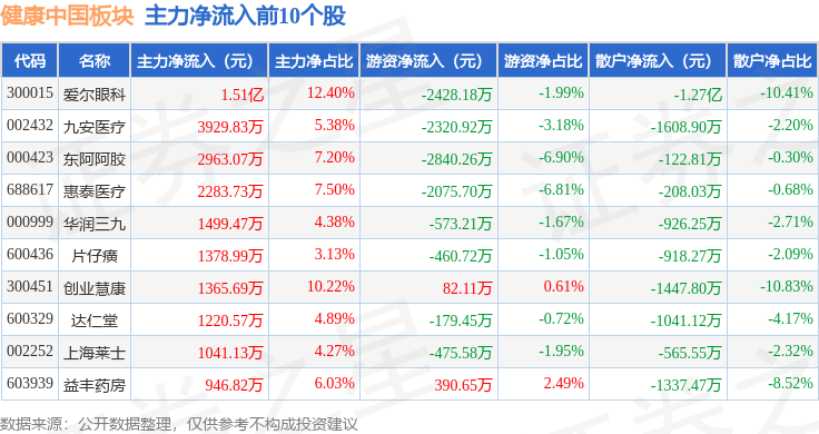 从资金流向上来看,当日健康中国板块主力资金净流出26.49亿元,游资资金净流入7.74亿元,散户资金净流入18.75亿元。健康中国板块个股资金流向见下表: