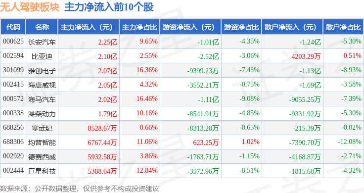 从资金流向上来看,当日无人驾驶板块主力资金净流出113.92亿元,游资资金净流入34.54亿元,散户资金净流入79.38亿元。无人驾驶板块个股资金流向见下表: