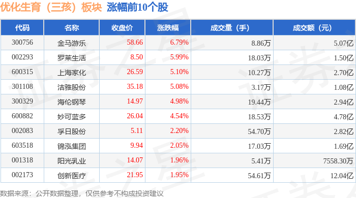 从资金流向上来看,当日优化生育(三孩)板块主力资金净流出6.87亿元,游资资金净流入1.2亿元,散户资金净流入5.67亿元。优化生育(三孩)板块个股资金流向见下表: