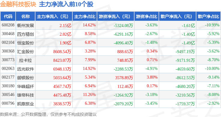 从资金流向上来看,当日金融科技板块主力资金净流出43.86亿元,游资资金净流入17.3亿元,散户资金净流入26.56亿元。金融科技板块个股资金流向见下表:
