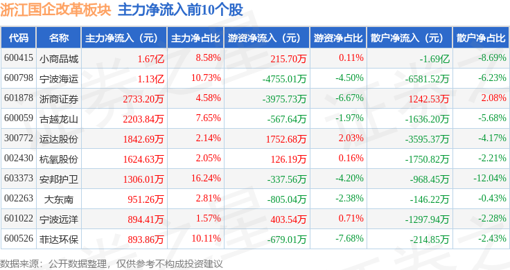 从资金流向上来看,当日浙江国企改革板块主力资金净流出3.65亿元,游资资金净流出8167.76万元,散户资金净流入4.46亿元。浙江国企改革板块个股资金流向见下表: