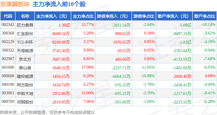 从资金流向上来看,当日京津冀板块主力资金净流出45.26亿元,游资资金净流入13.11亿元,散户资金净流入32.15亿元。京津冀板块个股资金流向见下表: