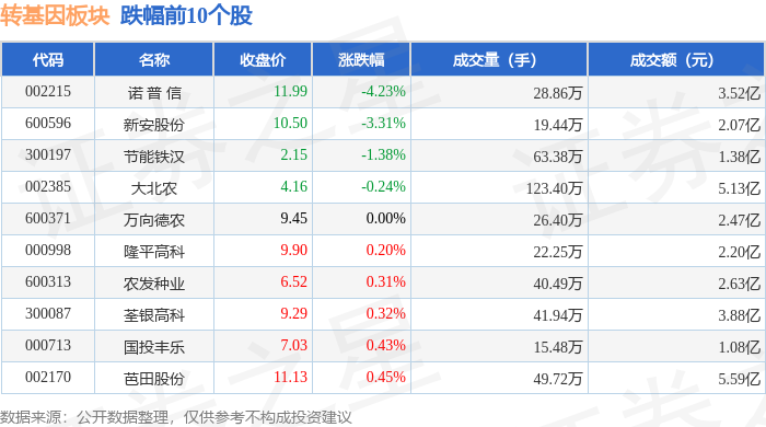 证券之星消息,10月14日转基因板块较上一交易日下跌0.82%,诺 普 信领跌。当日上证指数报收于3865.23,下跌0.62%。深证成指报收于12895.11,下跌2.54%。转基因板块个股涨跌见下表: