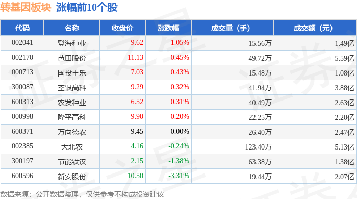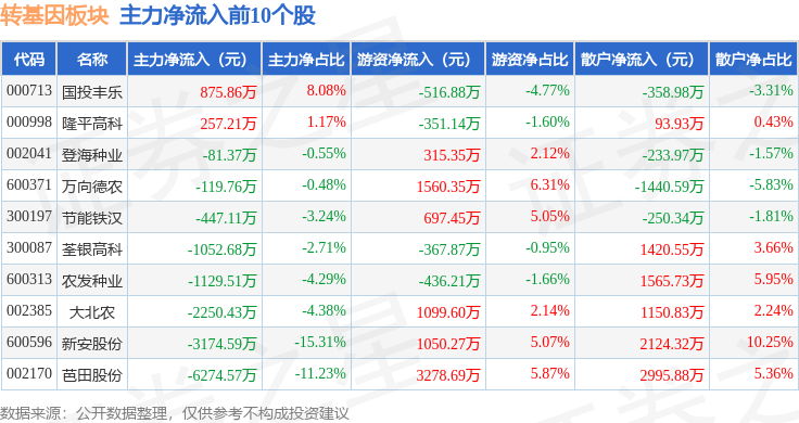 从资金流向上来看,当日转基因板块主力资金净流出2.07亿元,游资资金净流入1.2亿元,散户资金净流入8732.64万元。转基因板块个股资金流向见下表: