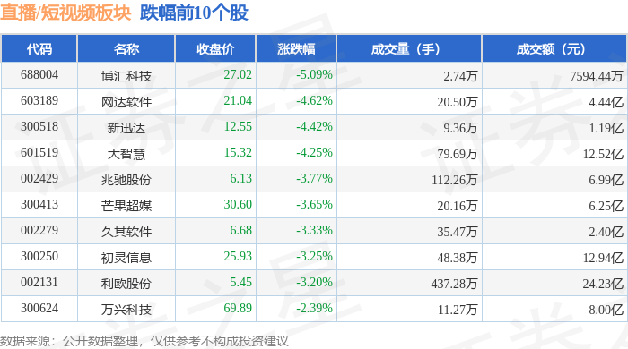 证券之星消息,10月14日直播/短视频板块较上一交易日下跌2.22%,博汇科技领跌。当日上证指数报收于3865.23,下跌0.62%。深证成指报收于12895.11,下跌2.54%。直播/短视频板块个股涨跌见下表: