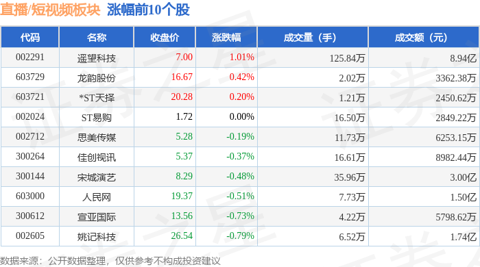 从资金流向上来看,当日直播/短视频板块主力资金净流出13.28亿元,游资资金净流入2.38亿元,散户资金净流入10.9亿元。直播/短视频板块个股资金流向见下表: