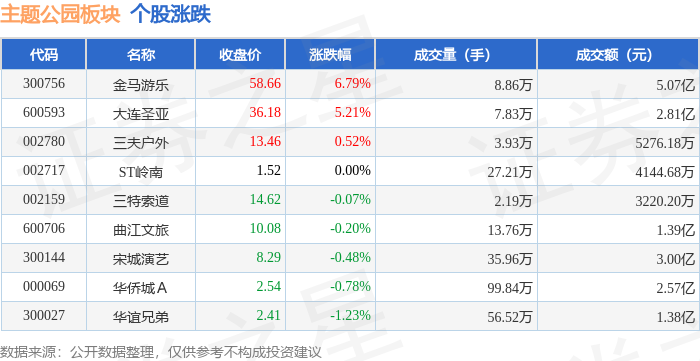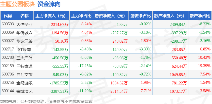 从资金流向上来看,当日主题公园板块主力资金净流出3718.29万元,游资资金净流入2360.58万元,散户资金净流入1357.71万元。主题公园板块个股资金流向见下表: