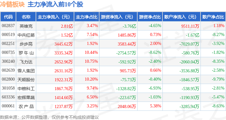 从资金流向上来看,当日冷链板块主力资金净流出13.11亿元,游资资金净流出3.99亿元,散户资金净流入17.09亿元。冷链板块个股资金流向见下表: