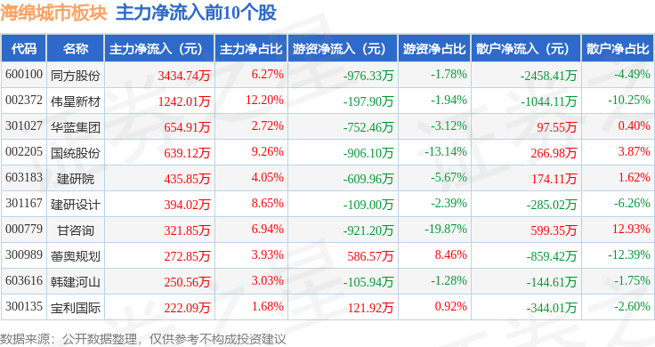 从资金流向上来看,当日海绵城市板块主力资金净流出1.42亿元,游资资金净流入1788.05万元,散户资金净流入1.24亿元。海绵城市板块个股资金流向见下表: