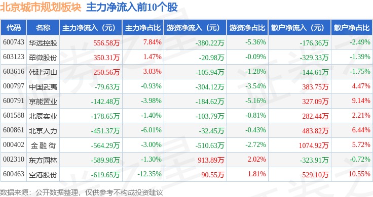 从资金流向上来看,当日北京城市规划板块主力资金净流出3.69亿元,游资资金净流出2268.78万元,散户资金净流入3.91亿元。北京城市规划板块个股资金流向见下表: