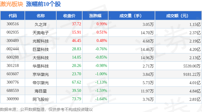 证券之星消息,10月14日激光板块较上一交易日下跌4.69%,杰普特领跌。当日上证指数报收于3865.23,下跌0.62%。深证成指报收于12895.11,下跌2.54%。激光板块个股涨跌见下表: