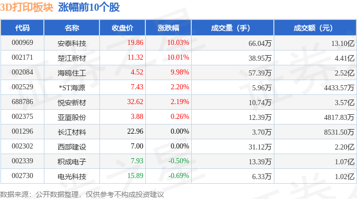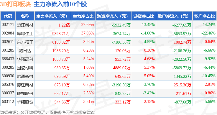 从资金流向上来看,当日3D打印板块主力资金净流出18.53亿元,游资资金净流入4.97亿元,散户资金净流入13.57亿元。3D打印板块个股资金流向见下表: