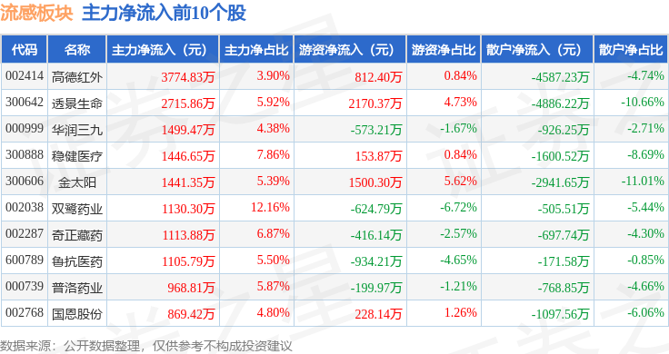 从资金流向上来看,当日流感板块主力资金净流出12.84亿元,游资资金净流入3.29亿元,散户资金净流入9.55亿元。流感板块个股资金流向见下表: