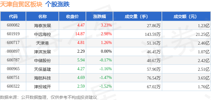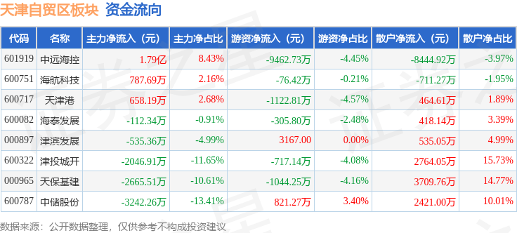 从资金流向上来看,当日天津自贸区板块主力资金净流入1.08亿元,游资资金净流出1.19亿元,散户资金净流入1156.43万元。天津自贸区板块个股资金流向见下表: