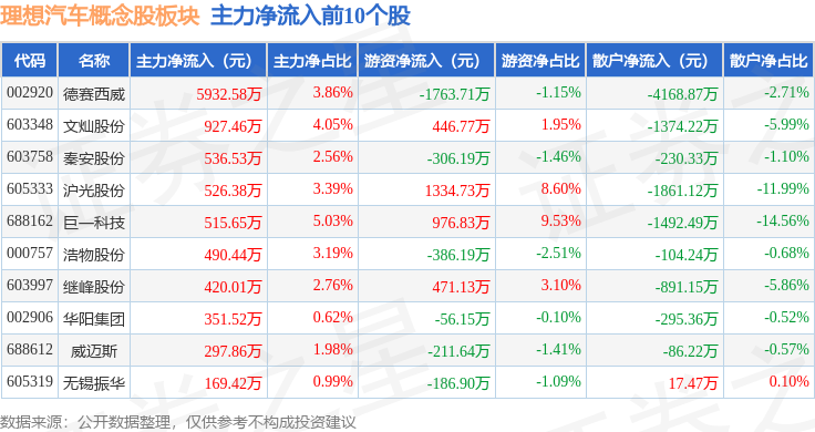 从资金流向上来看,当日理想汽车概念股板块主力资金净流出10.96亿元,游资资金净流入3.38亿元,散户资金净流入7.59亿元。理想汽车概念股板块个股资金流向见下表:
