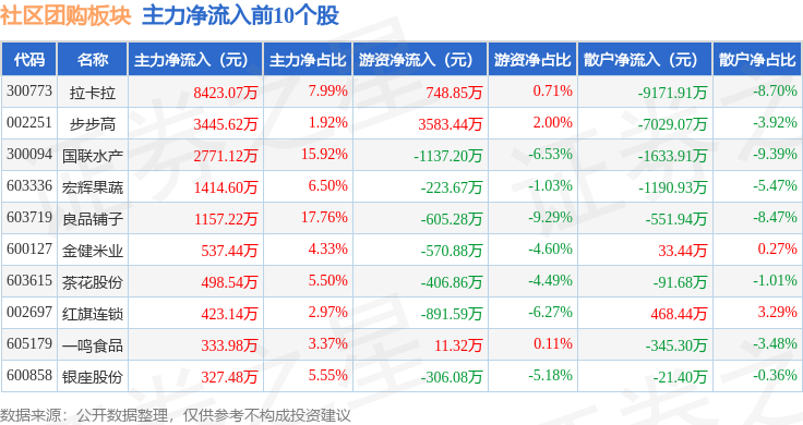 从资金流向上来看,当日社区团购板块主力资金净流出6618.59万元,游资资金净流出2177.27万元,散户资金净流入8795.86万元。社区团购板块个股资金流向见下表: