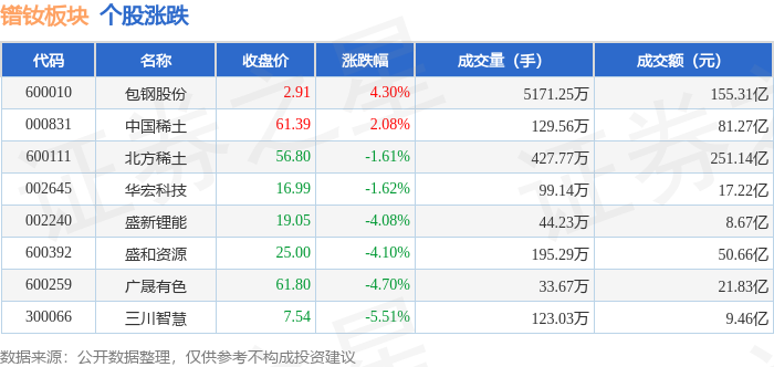 从资金流向上来看,当日镨钕板块主力资金净流出28.69亿元,游资资金净流入7.27亿元,散户资金净流入21.42亿元。镨钕板块个股资金流向见下表: