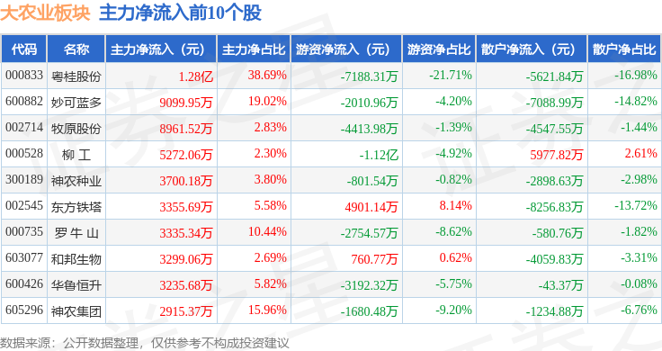 从资金流向上来看,当日大农业板块主力资金净流出18.04亿元,游资资金净流入5213.59万元,散户资金净流入17.52亿元。大农业板块个股资金流向见下表: