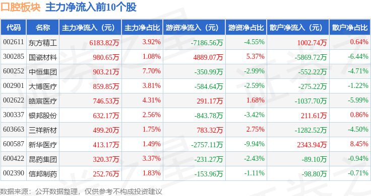 从资金流向上来看,当日口腔板块主力资金净流出7.54亿元,游资资金净流入9128.94万元,散户资金净流入6.62亿元。口腔板块个股资金流向见下表: