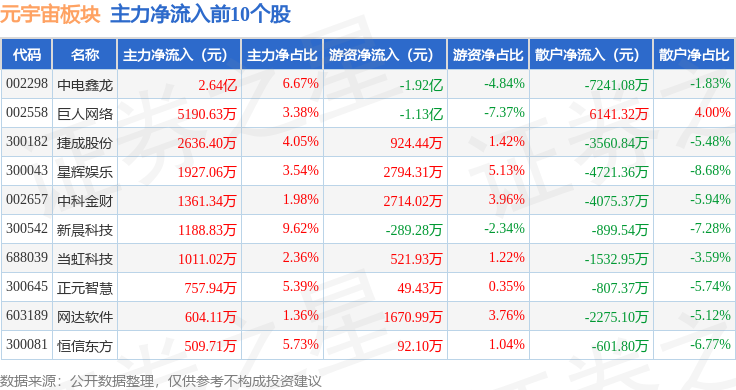 从资金流向上来看,当日元宇宙板块主力资金净流出55.66亿元,游资资金净流入12.67亿元,散户资金净流入42.98亿元。元宇宙板块个股资金流向见下表: