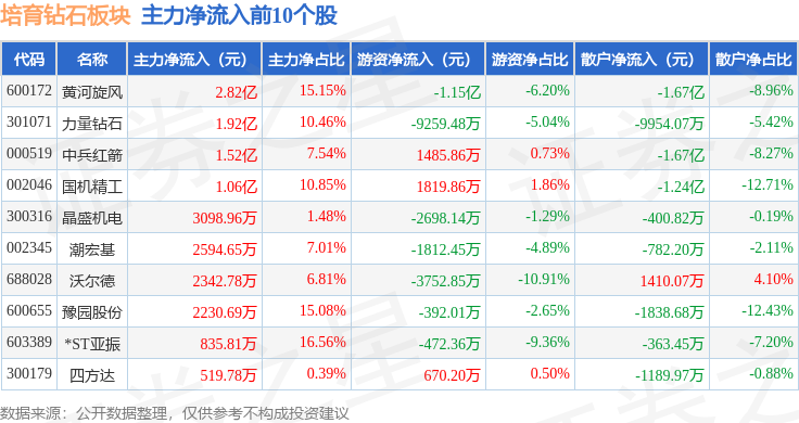 从资金流向上来看,当日培育钻石板块主力资金净流入8.34亿元,游资资金净流出2.67亿元,散户资金净流出5.67亿元。培育钻石板块个股资金流向见下表: