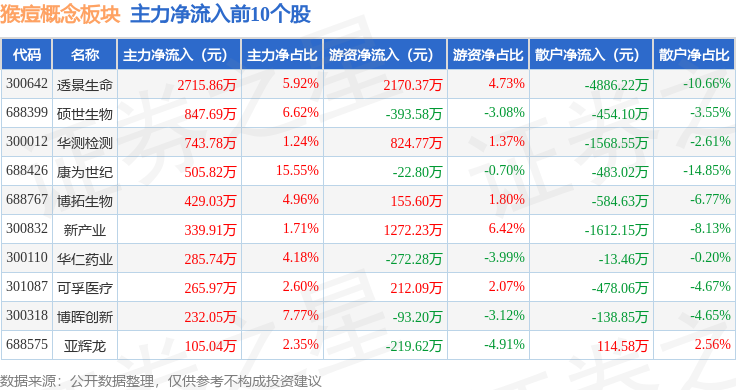 从资金流向上来看,当日猴痘概念板块主力资金净流出2.38亿元,游资资金净流入1.22亿元,散户资金净流入1.16亿元。猴痘概念板块个股资金流向见下表: