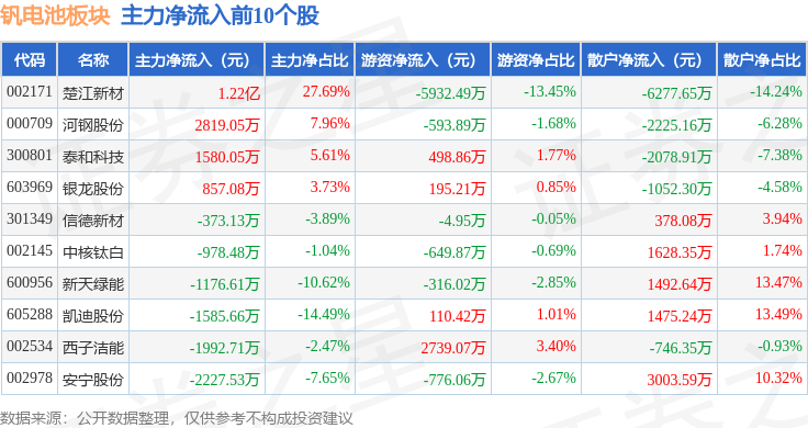 从资金流向上来看,当日钒电池板块主力资金净流出12.85亿元,游资资金净流入4.13亿元,散户资金净流入8.72亿元。钒电池板块个股资金流向见下表: