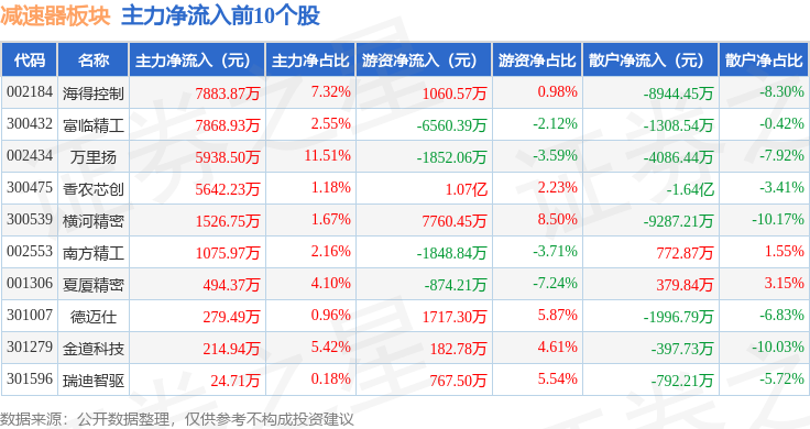 从资金流向上来看,当日减速器板块主力资金净流出24.86亿元,游资资金净流入6.91亿元,散户资金净流入17.95亿元。减速器板块个股资金流向见下表: