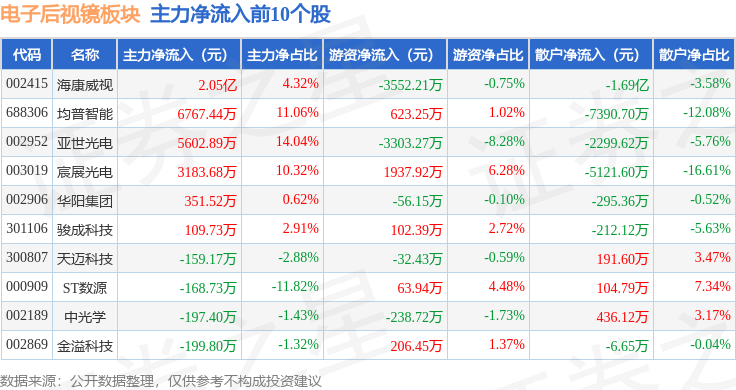 从资金流向上来看,当日电子后视镜板块主力资金净流出31.42亿元,游资资金净流入10.91亿元,散户资金净流入20.51亿元。电子后视镜板块个股资金流向见下表:
