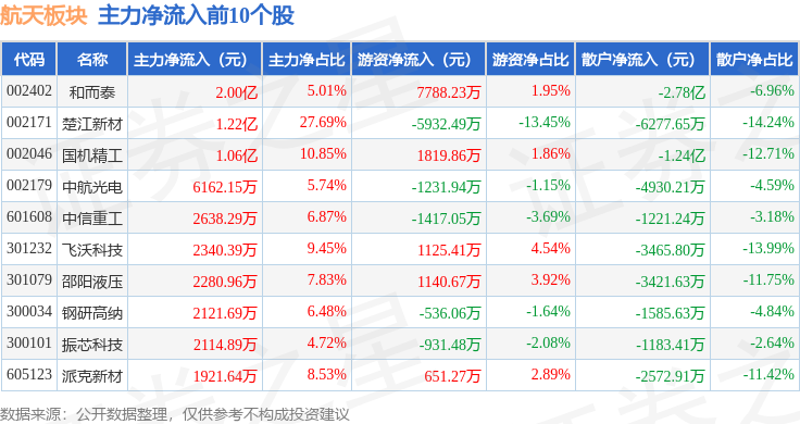 从资金流向上来看,当日航天板块主力资金净流出10.57亿元,游资资金净流入3.21亿元,散户资金净流入7.37亿元。航天板块个股资金流向见下表: