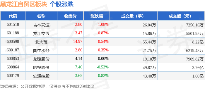 证券之星消息,10月14日黑龙江自贸区板块较上一交易日上涨0.08%,吉林高速领涨。当日上证指数报收于3865.23,下跌0.62%。深证成指报收于12895.11,下跌2.54%。黑龙江自贸区板块个股涨跌见下表: