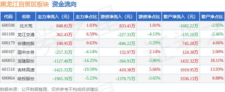 从资金流向上来看,当日黑龙江自贸区板块主力资金净流出3459.28万元,游资资金净流出1372.47万元,散户资金净流入4831.75万元。黑龙江自贸区板块个股资金流向见下表: