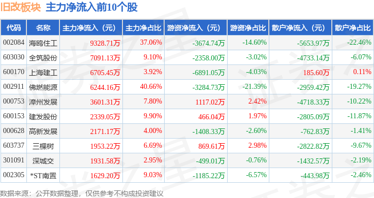 从资金流向上来看,当日旧改板块主力资金净流出8.47亿元,游资资金净流入1.48亿元,散户资金净流入7.0亿元。旧改板块个股资金流向见下表: