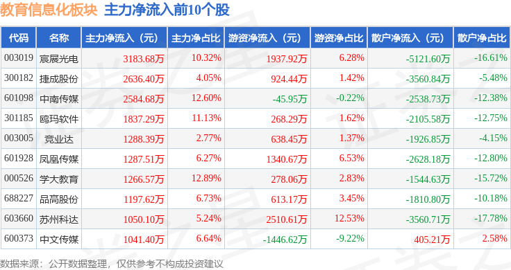 从资金流向上来看,当日教育信息化板块主力资金净流出20.5亿元,游资资金净流入6.69亿元,散户资金净流入13.8亿元。教育信息化板块个股资金流向见下表: