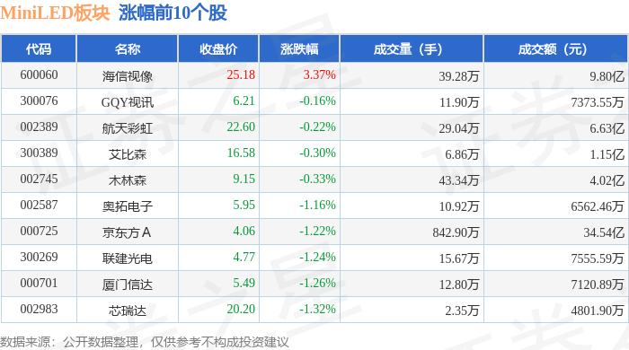 从资金流向上来看,当日MiniLED板块主力资金净流出29.42亿元,游资资金净流入8.58亿元,散户资金净流入20.83亿元。MiniLED板块个股资金流向见下表: