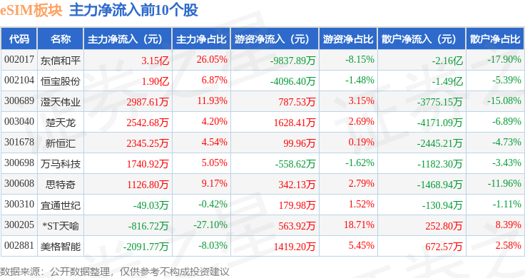 从资金流向上来看,当日eSIM板块主力资金净流入1.8亿元,游资资金净流入1.52亿元,散户资金净流出3.32亿元。eSIM板块个股资金流向见下表: