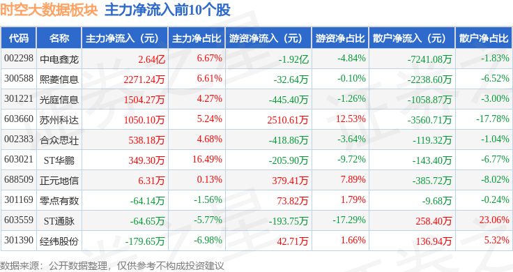 从资金流向上来看,当日时空大数据板块主力资金净流出2.88亿元,游资资金净流入4057.02万元,散户资金净流入2.47亿元。时空大数据板块个股资金流向见下表: