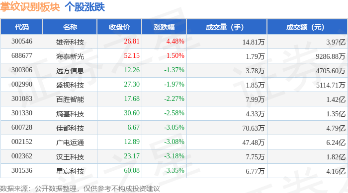 证券之星消息,10月14日掌纹识别板块较上一交易日下跌2.35%,星宸科技领跌。当日上证指数报收于3865.23,下跌0.62%。深证成指报收于12895.11,下跌2.54%。掌纹识别板块个股涨跌见下表: