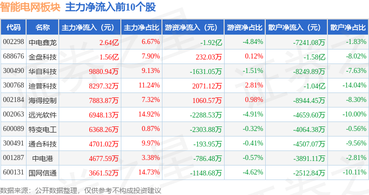 从资金流向上来看,当日智能电网板块主力资金净流出53.41亿元,游资资金净流入16.06亿元,散户资金净流入37.35亿元。智能电网板块个股资金流向见下表: