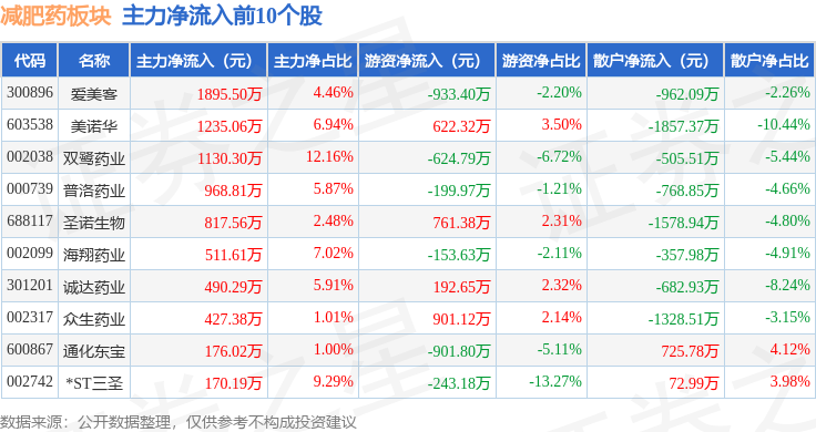 从资金流向上来看,当日减肥药板块主力资金净流出12.25亿元,游资资金净流入3.14亿元,散户资金净流入9.1亿元。减肥药板块个股资金流向见下表:
