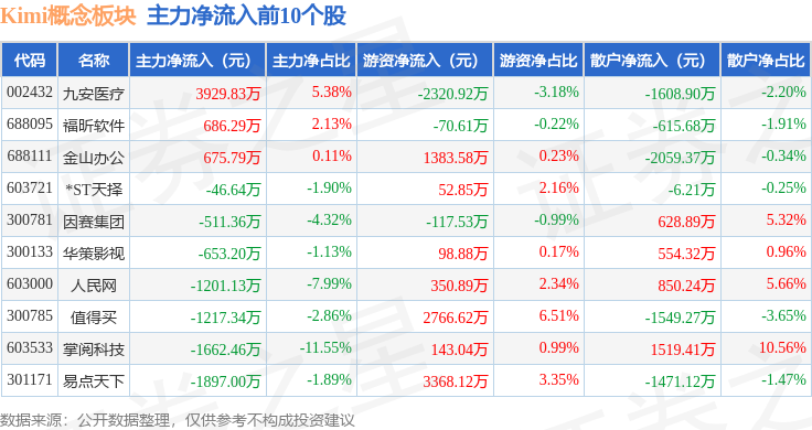 从资金流向上来看,当日Kimi概念板块主力资金净流出7.4亿元,游资资金净流入3.06亿元,散户资金净流入4.34亿元。Kimi概念板块个股资金流向见下表: