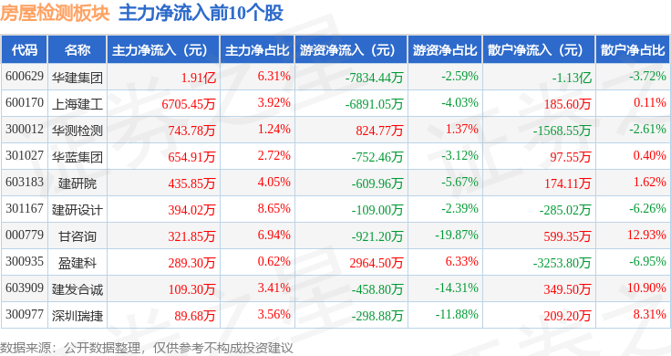 从资金流向上来看,当日房屋检测板块主力资金净流入2.13亿元,游资资金净流出1.66亿元,散户资金净流出4688.0万元。房屋检测板块个股资金流向见下表: