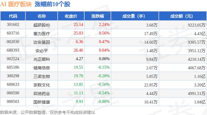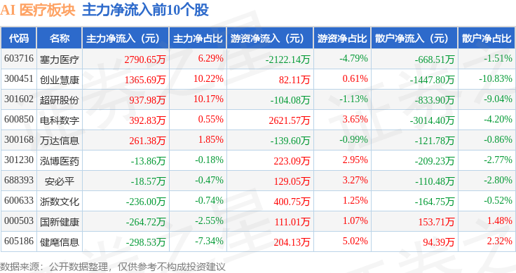 从资金流向上来看,当日AI 医疗板块主力资金净流出2.9亿元,游资资金净流入1.34亿元,散户资金净流入1.55亿元。AI 医疗板块个股资金流向见下表: