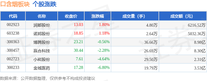 证券之星消息,10月14日口含烟板块较上一交易日下跌2.11%,金城医药领跌。当日上证指数报收于3865.23,下跌0.62%。深证成指报收于12895.11,下跌2.54%。口含烟板块个股涨跌见下表: