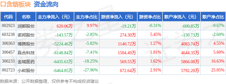 从资金流向上来看,当日口含烟板块主力资金净流出2.38亿元,游资资金净流入4142.48万元,散户资金净流入1.97亿元。口含烟板块个股资金流向见下表: