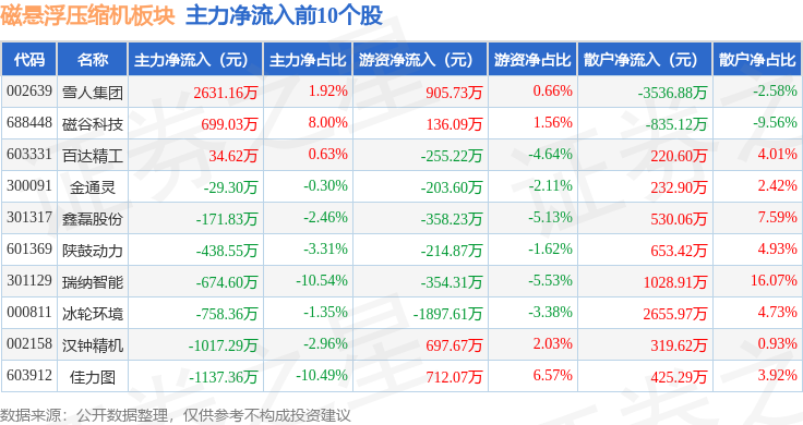 从资金流向上来看,当日磁悬浮压缩机板块主力资金净流出1.8亿元,游资资金净流出575.91万元,散户资金净流入1.86亿元。磁悬浮压缩机板块个股资金流向见下表: