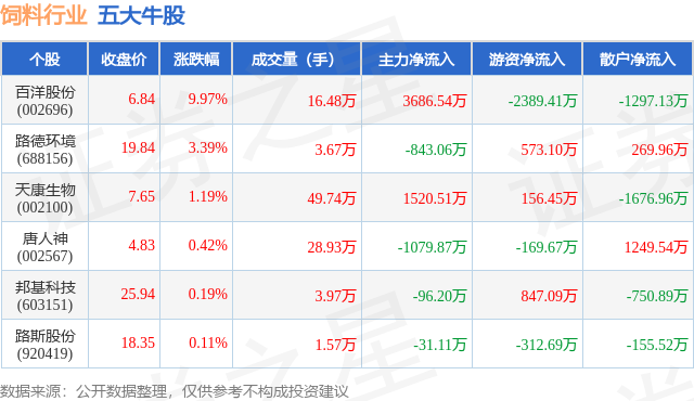 个股表现方面,饲料行业当日领涨股为百洋股份(002696),该股当日报收6.84,上涨9.97%,成交量16.48万,主力资金净流入3686.54万元。路德环境(688156)以上涨3.39%紧随其后,该股当日成交量3.67万,主力资金净流出843.06万元。除此之外,天康生物(002100)、唐人神(002567)、邦基科技(603151)均进入当日牛股之列。具体个股列表见下表: