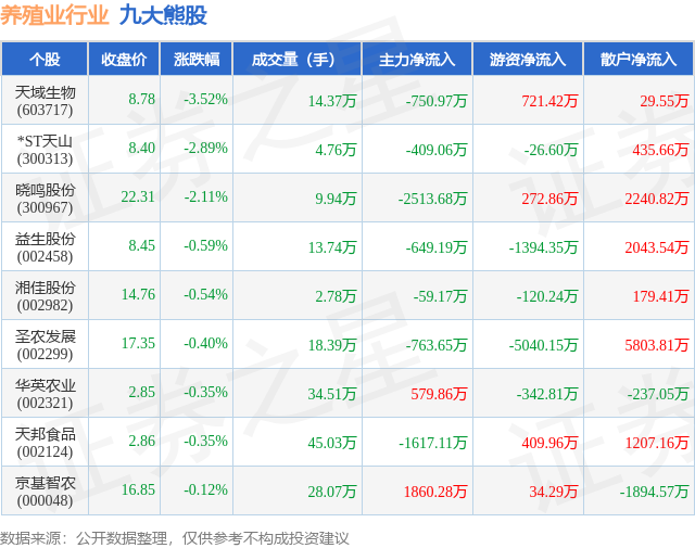 个股表现方面,养殖业行业当日领跌股为天域生物(603717),该股当日报收8.78,下跌3.52%,成交量14.37万,主力资金净流出750.97万元。*ST天山(300313)以下跌2.89%紧随其后,该股当日成交量4.76万,主力资金净流出409.06万元。除此之外,晓鸣股份(300967)、益生股份(002458)、湘佳股份(002982)均进入当日熊股之列。具体个股列表见下表: